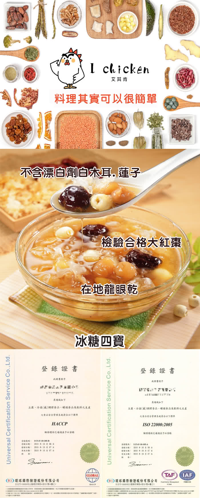 2.商品品名:【艾其肯】冰糖桂圓紅棗銀耳蓮子湯(冰糖四寶) 3.商品重(容)量: 350公克±5% (固形物144公克±10%) 4.內容物名稱(成分):水.白木耳.蓮子.桂圓.紅棗.冰糖.鹽 5.食品添加物名稱:無 6.原產地(國):台灣 7.製造廠商或國內負責廠商名稱:艾其肯有限公司 8.製造廠商或國內負責廠商地址:台南市關廟區深坑里深坑二街106巷32號 9.製造廠商或國內負責廠商電話:06-5958503 10.以消費者收受日算起,至少距有效日期前?日以上:45 11.食品業者登錄字號:F-170624227-00000-3 12.投保產品責任險字號:0900-0333000521-05 備註欄:無